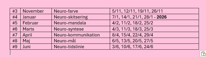 Neurographica algoritmer #1-9 kalenderoversigt for LIVE undervisning 2025-26.